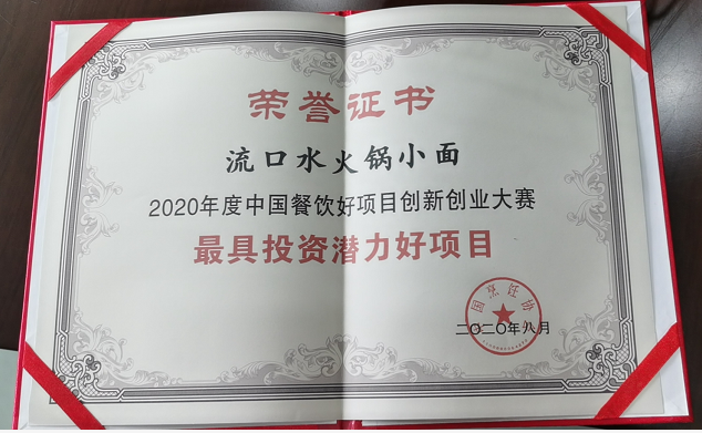 本届大赛吸引了上百家餐饮品牌积极参与,通过线上投票,专家评审等层层选拔,最终流口水火锅小面获得2020中国餐饮好项目创新创业大赛“最具投资潜力好项目”奖!